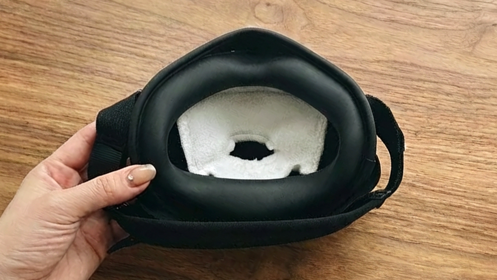 顔のラインに沿うように作られていて、肌に当たる部分にはやわらかいシリコン素材のクッションが使われています。