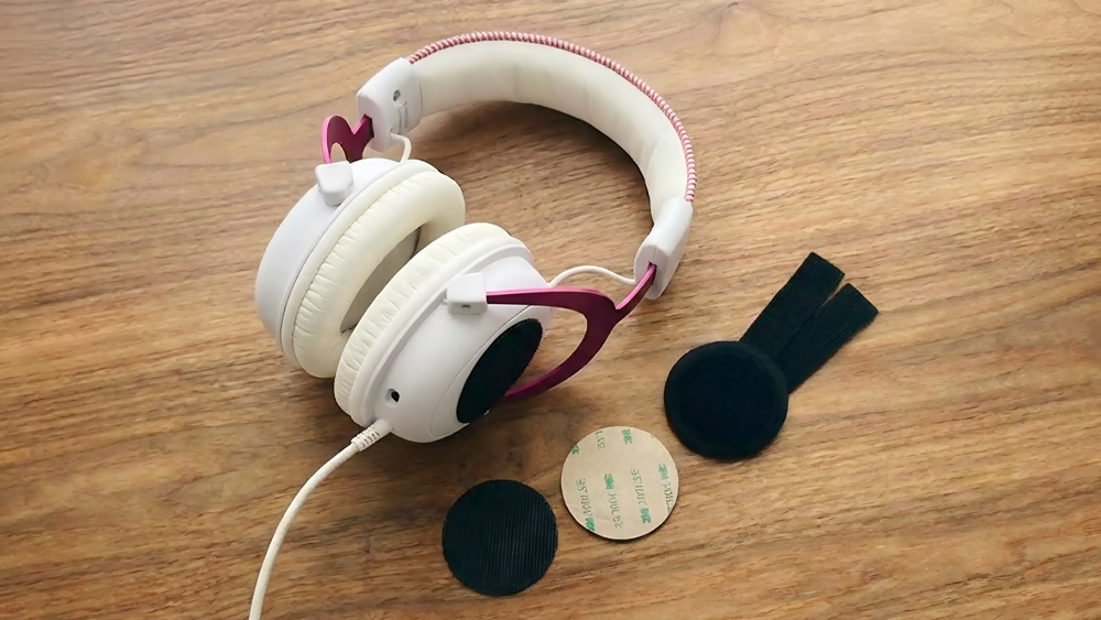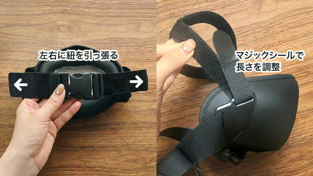 取り付け方法はシンプルで、まずヘッドセットの左右に、付属の両面テープ付き固定パーツを貼り付けます。その固定パーツに、ヘッドセットストラップを使ってVEKTAを連結する形です。