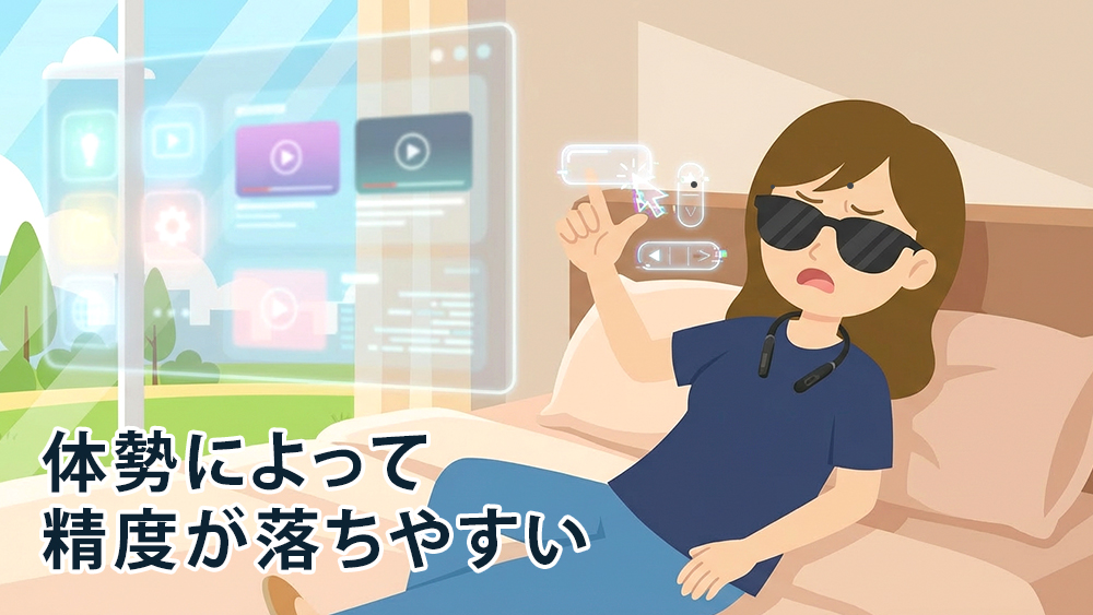 とくに寝転がった状態だと、手の認識精度が一気に落ちやすく、クリックがなかなか反応してくれなかったり、そもそも手そのものを認識してくれなかったりする場面がしばしばありました。