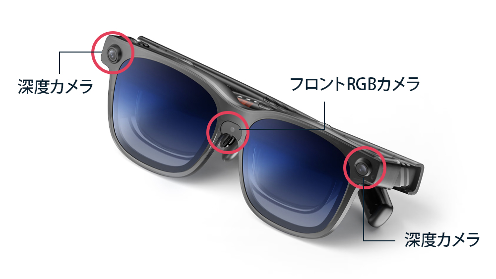 また、グラス自体には、RGBカメラと深度センサーを含むトリプルカメラシステムを搭載しています。(※ちなみに商品が手元に届いた際は、フロントRGBカメラには保護シールが貼られています)