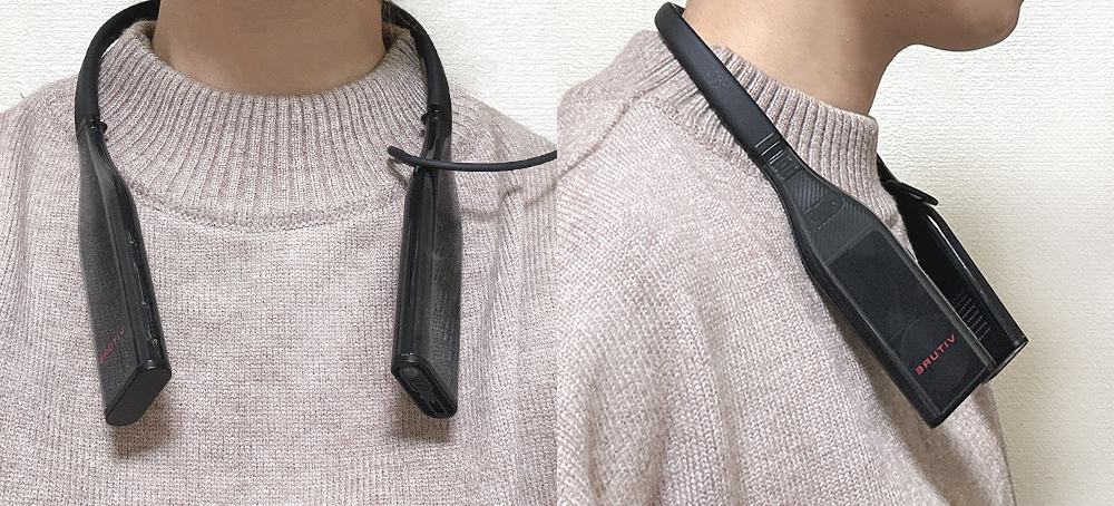 実際に Pro ネックバンドを首にかけてみると、見た目どおりネックスピーカーのような感覚で、数値上は約170gありますが、重心が左右にきちんと分散されているおかげか、窮屈さはあまり感じませんでした。